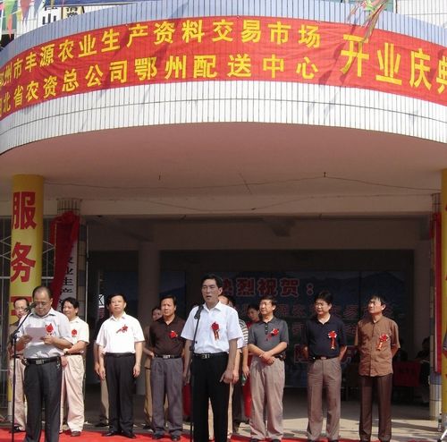 2004年9月16日上午,“湖北省農(nóng)資總公司鄂州配送中心”、“中國石化湖北化肥分公司‘長江’牌尿素鄂州總代理”、“鄂州市農(nóng)業(yè)生產(chǎn)資料行業(yè)協(xié)會”和“鄂州市豐源農(nóng)業(yè)生產(chǎn)資料交易市場”的揭牌儀式同時在鄂州市杜山鎮(zhèn)豐源農(nóng)業(yè)生產(chǎn)資料交易市場隆重舉行。省供銷社主任張祖新、省供銷社副主任張裕才、省農(nóng)資總公司總經(jīng)理熊治海、鄂州市人大副主任邱則富、鄂州市政府副市長陳邦利、鄂州市政協(xié)副主席姚源森、鄂州市供銷社主任趙國超、中國石化湖北化肥分公司市場部、銷售部有關(guān)負責同志及其他相關(guān)部門領(lǐng)導出席了儀式。