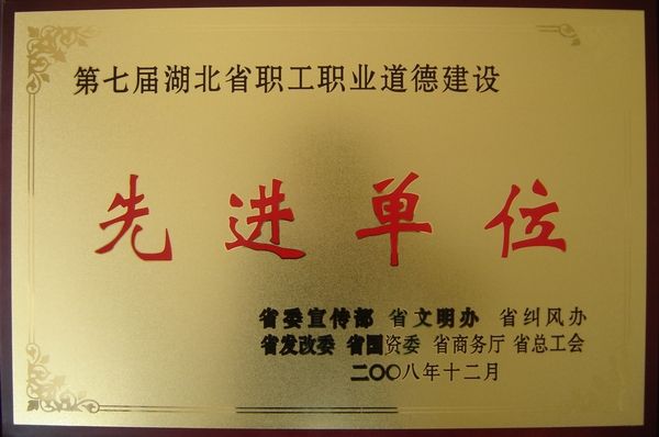 2009年3月,公司被省委宣傳部、省文明辦、省糾風(fēng)辦、省發(fā)改委、省國(guó)資委、省商務(wù)廳、省總工會(huì)聯(lián)合評(píng)為“第七屆湖北省職工職業(yè)道德建設(shè)先進(jìn)單位”。