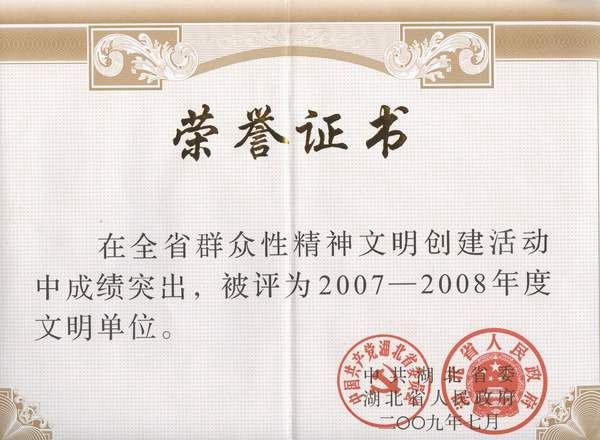 湖北省農(nóng)業(yè)生產(chǎn)資料集團(tuán)有限公司被中共湖北省委、湖北省人民政府評為2007-2008年度文明單位。