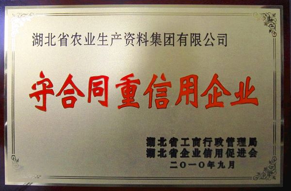20010年10月,湖北省農(nóng)業(yè)生產(chǎn)資料集團有限公司被湖北省工商行政管理局和湖北省企業(yè)信用促進會聯(lián)合認定為湖北省“守合同重信用企業(yè)”。